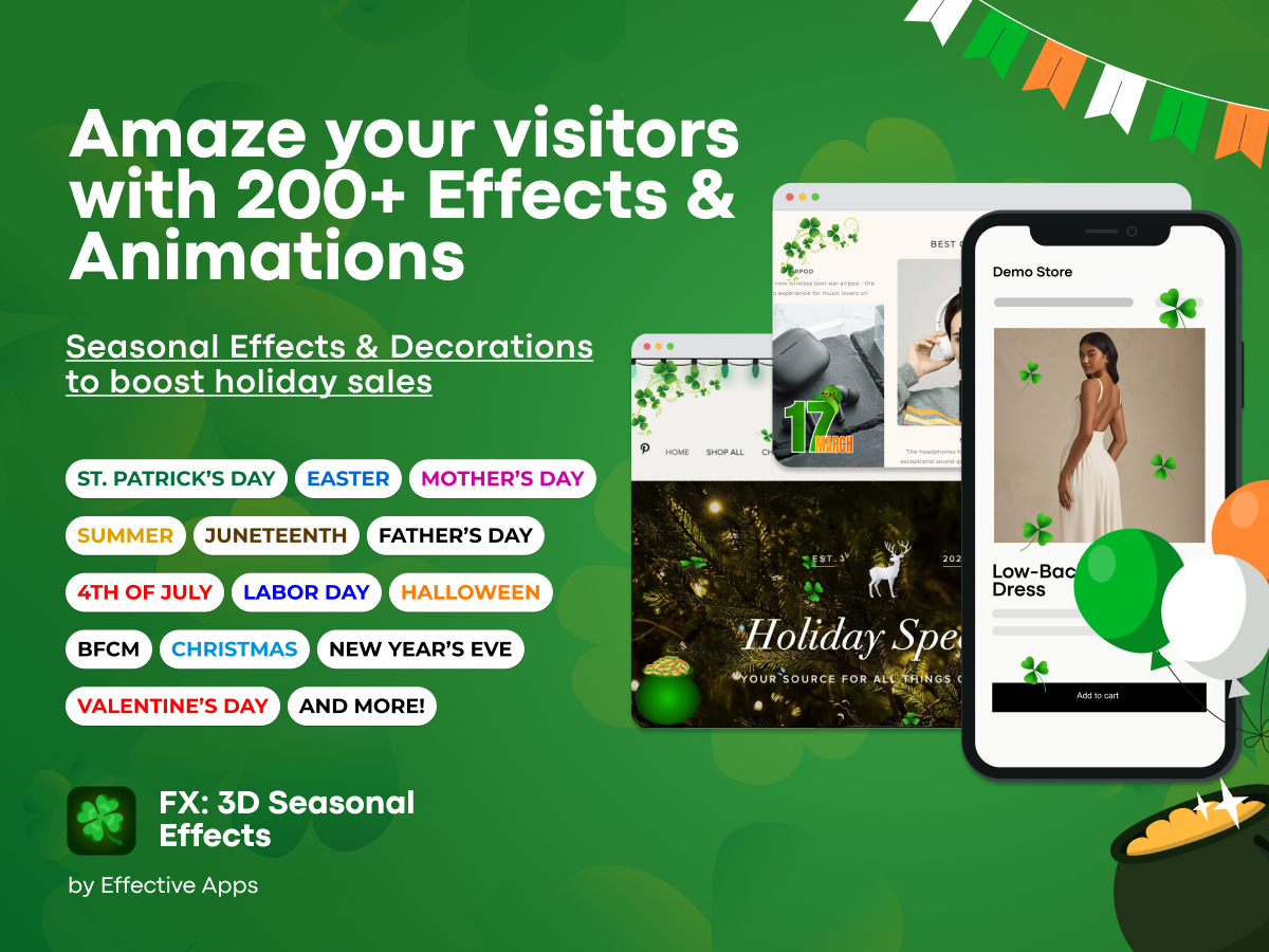 Adjust speed, density, placement. Show effects across your site or only on selected pages. Celebrate St. Patrick's Day, Easter, Mother’s Day, Halloween, Black Friday, New Year and more - with effects that keep customers engaged and excited to shop