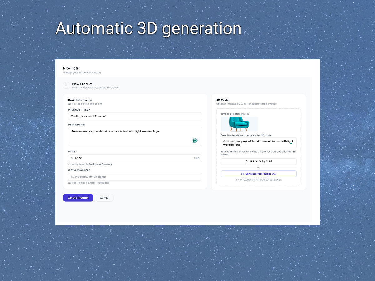 Upload product photos and we’ll turn them into interactive 3D models. No modeling skills needed. Customers can rotate and inspect products before buying, which helps build trust and can reduce returns.