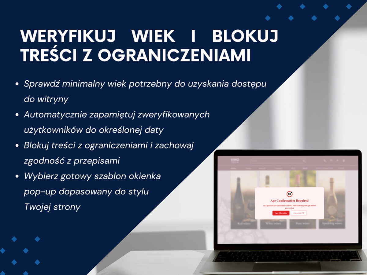 Zadbaj, aby Twoja strona ograniczała dostęp do treści dla dorosłych dzięki intuicyjnemu oknu weryfikacji wieku. Ustal limity wieku, takie jak 18+, 21+ lub inne, by łatwo spełnić wymagania prawne. Wybierz gotowe szablony dopasowane do stylu strony i dodaj swoje logo, aby zachować spójność marki.