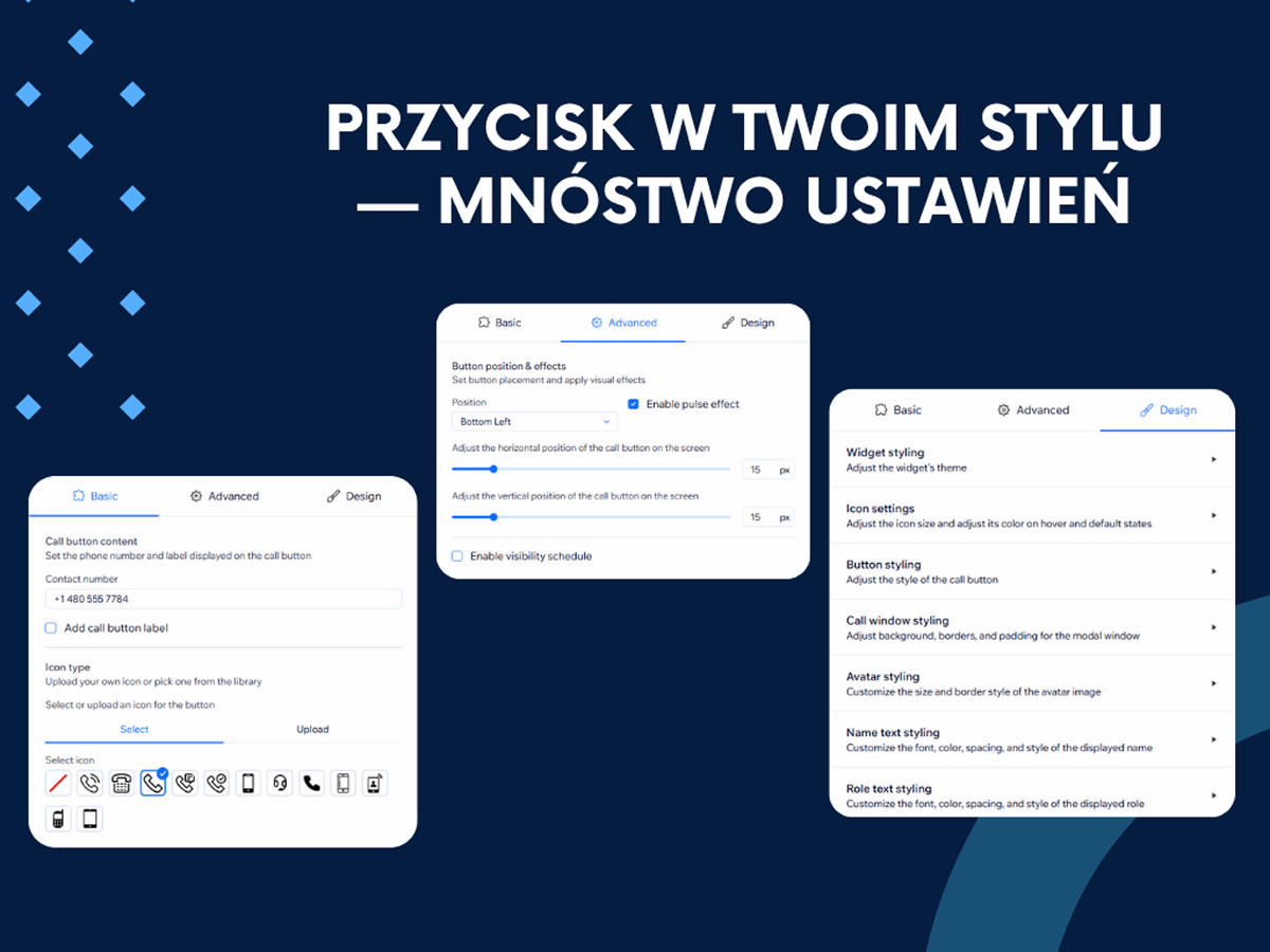 Dostosuj wygląd przycisku połączenia – zmień ikonę, kolor, rozmiar i pozycję, by idealnie pasował do stylu Twojego sklepu.
