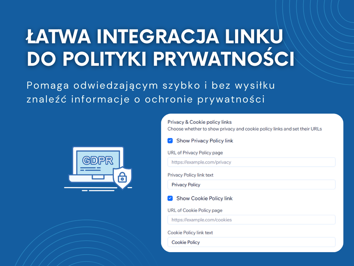 Wyświetlaj zgodny z prawem baner cookies, komunikat lub wyskakujące okno prywatności, które jasno informuje użytkowników o wykorzystaniu cookies na stronie i pomaga w zbieraniu ważnej zgody — bez konieczności programowania.
