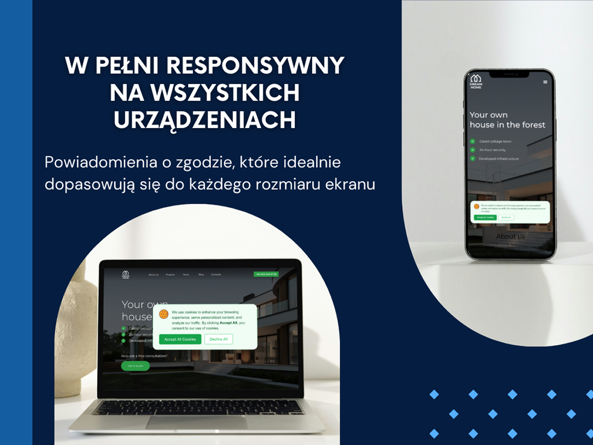 Wybieraj spośród gotowych szablonów pasków cookies i łatwo ustawiaj ich pozycję, aby pasowały do stylu Twojej strony. Prosty i nowoczesny design doskonale wygląda na wszystkich urządzeniach, zarówno mobilnych, jak i desktopowych, dzięki w pełni responsywnym banerom.
