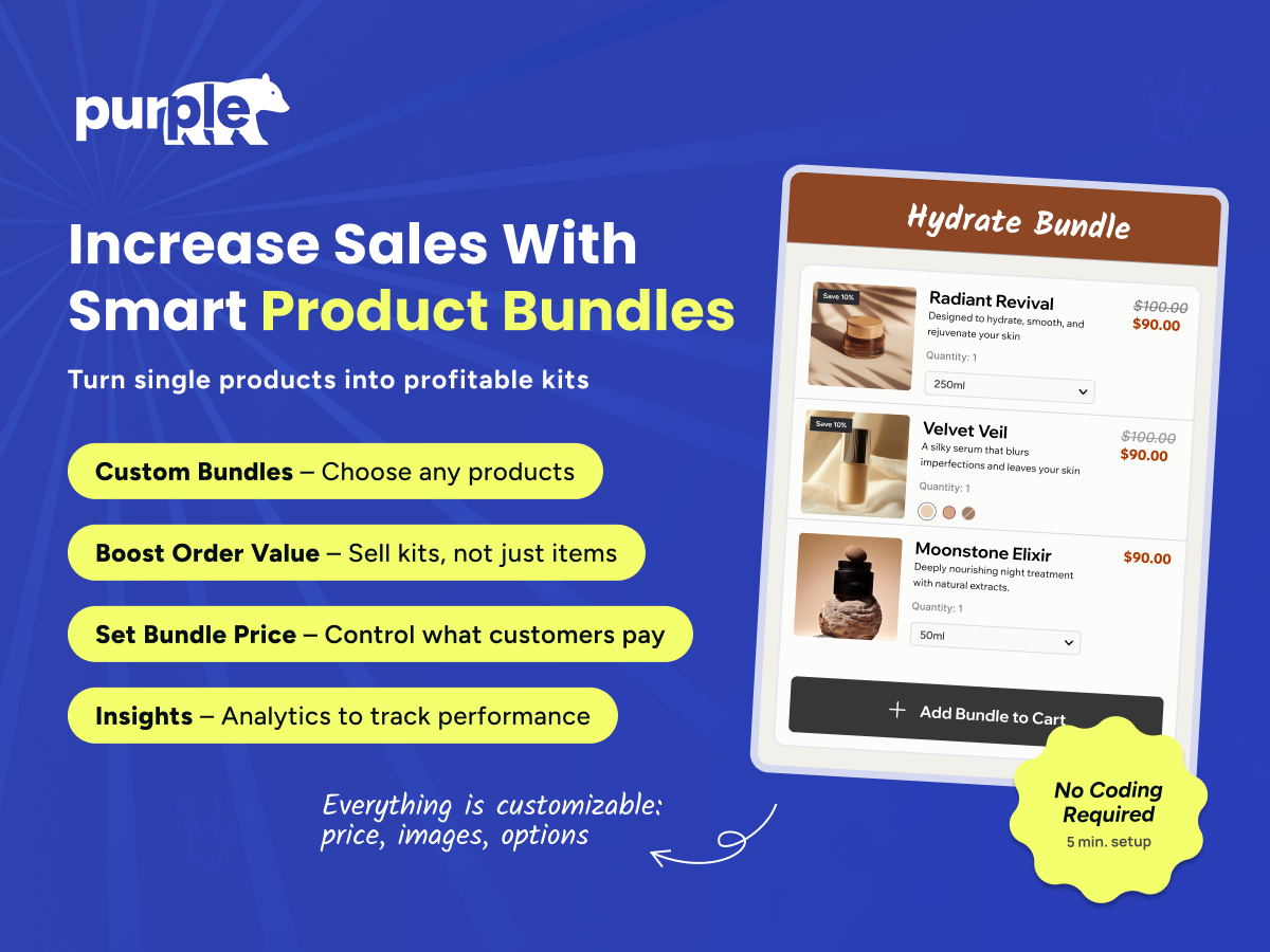 Twórz i zarządzaj pakietami produktów, które zwiększają sprzedaż i średnią wartość zamówienia — bez konieczności kodowania. Dzięki aplikacji Product Bundle możesz połączyć wiele produktów w jedną, przecenioną ofertę i zaprezentować ją jako nowy, samodzielny produkt.