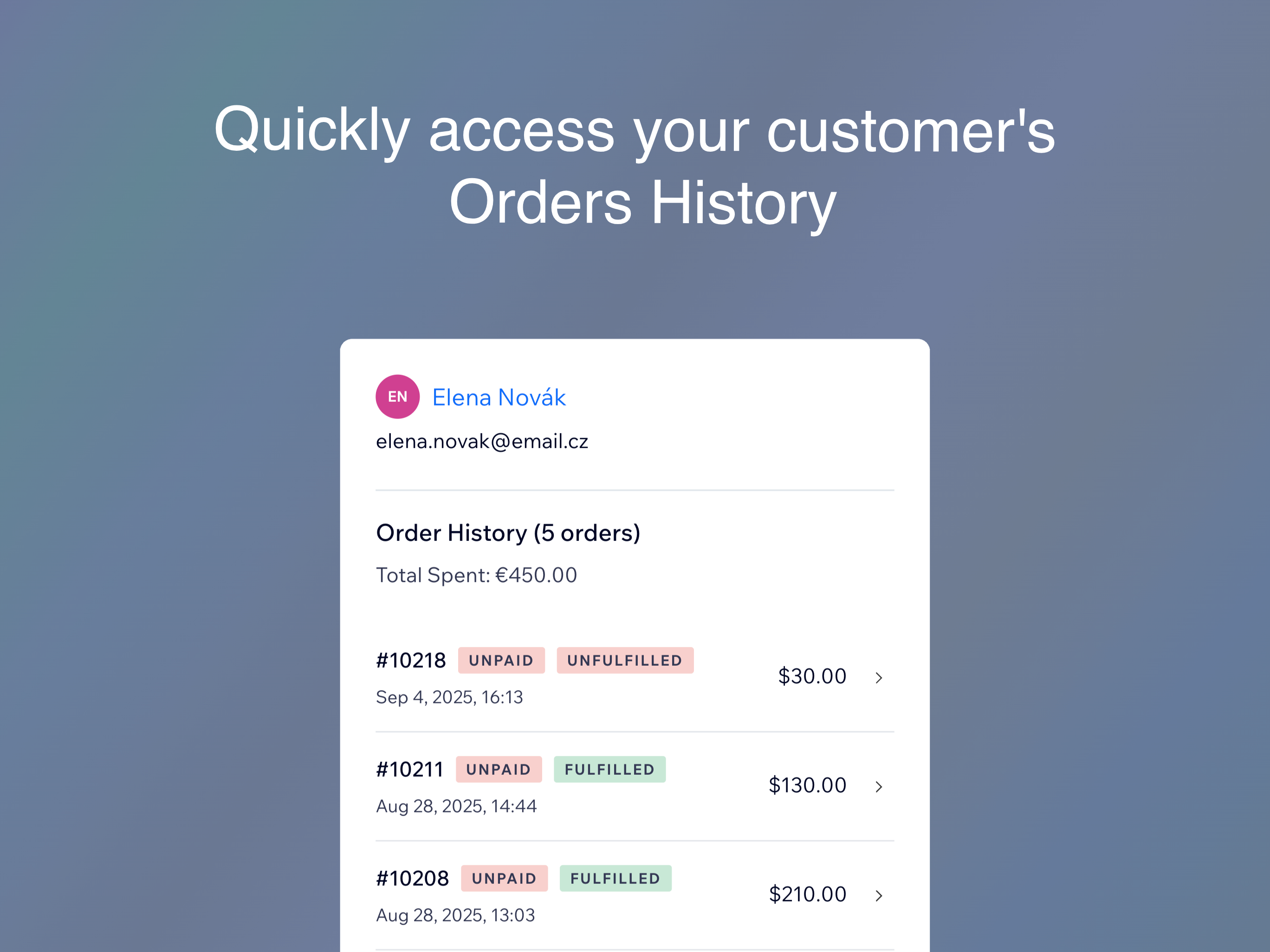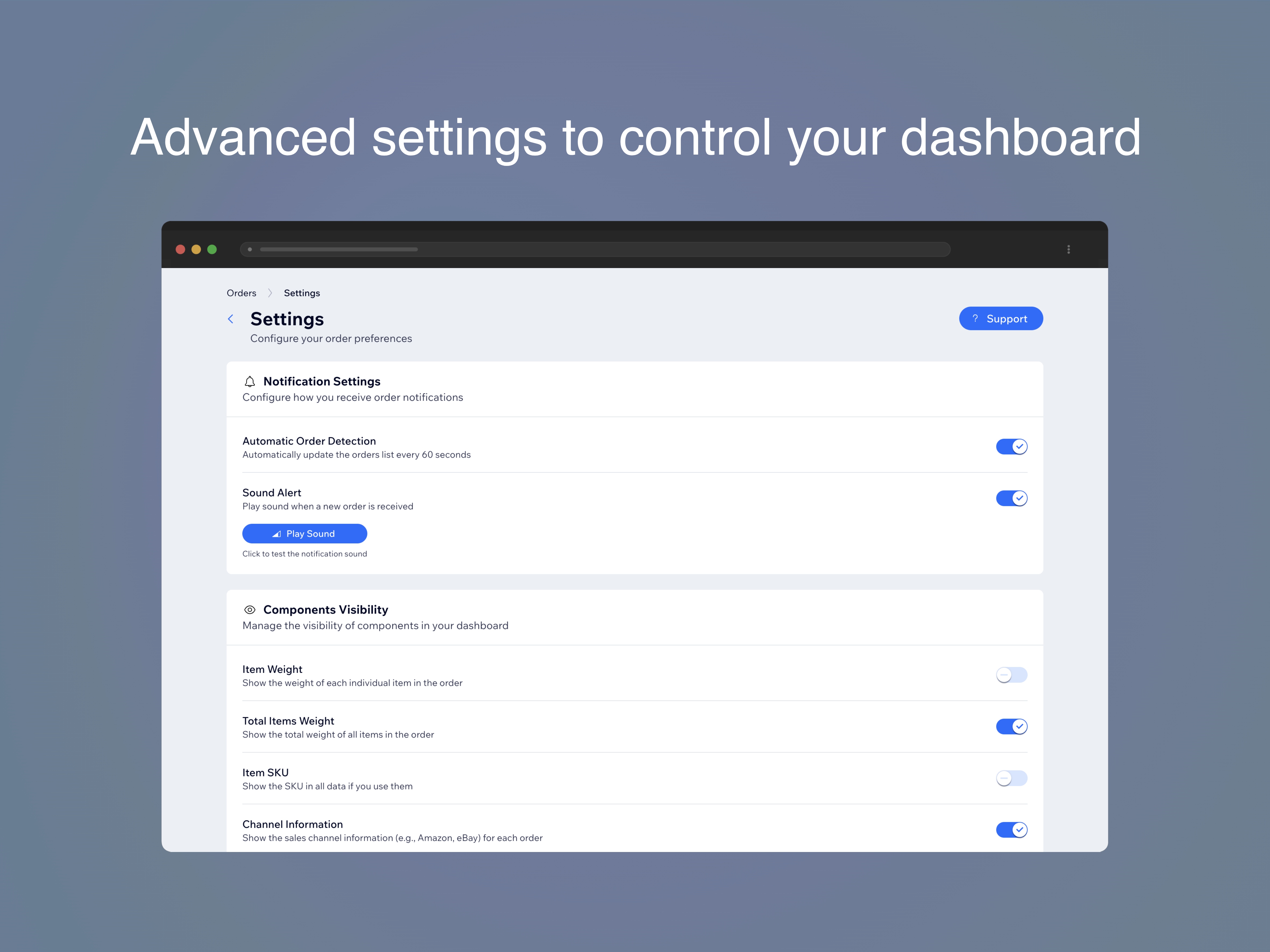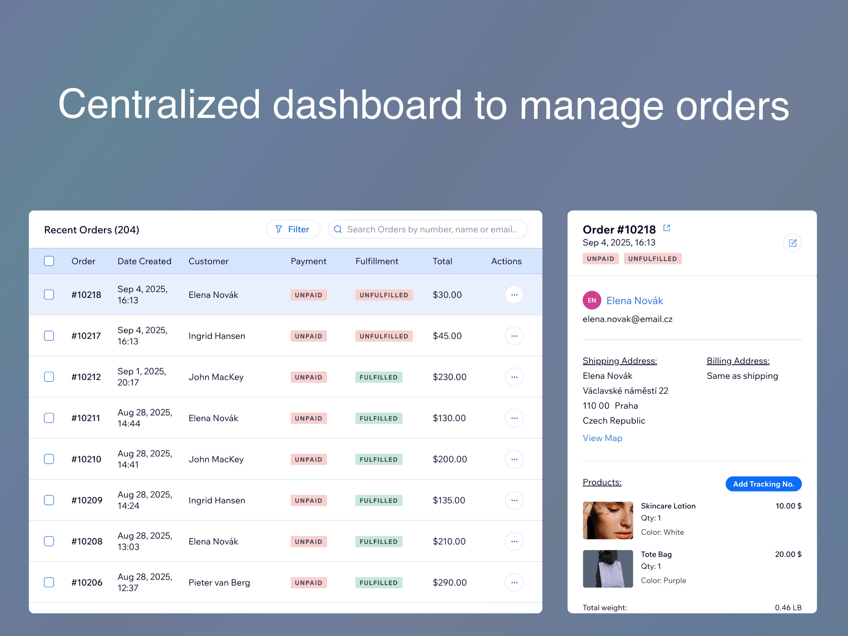 Manage your store's orders with a centralized dashboard. Explore features that help you fulfill orders quicker. Manage the order list and order details on a single page, add tracking information to custom items, export packing lists, view the customer's order history—all from one intuitive interface. Gain valuable insights with a modular analytics header. Additional details such as item weights, SKUs, sales channel and more data at a glance. Boost efficiency with local filtering by SKU, customizable order batch sizes, visual highlighting of key orders and even badges assigned to customer based on their loyalty. Stay on top of new orders with real-time sound notifications. Quickly navigate to the product pages with a single click on item images and more. Designed specifically for store owners who demand more, this extension integrates seamlessly with your existing dashboard.